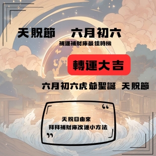 每年農曆六月初六被稱為「天貺節」,今年的天貺節落在國曆7月11日,相傳在天貺節這一天玉皇大帝會大開天門、直接聆聽信徒們的心願,所以在天貺節求財、求壽、補運、補財庫,都特別靈驗!如果最近感到不順遂,不妨把握天貺節幫自己把霉運轉好運!